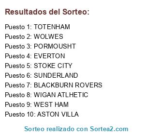Lista de participantes: WIGAN ATLHETIC, SUNDERLAND, STOKE CITY, PORMOUSHT, BLACKBURN ROVERS, WOLWES, WEST HAM, TOTENHAM, EVERTON, ASTON VILLA.