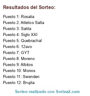 Lista de participantes: Satita, Swenden, Rosalia, Monos, Siglo XXI, GYT, Albitos, Brujita, Quebrachal, Atletico Salta, Moreno, 12avo.
