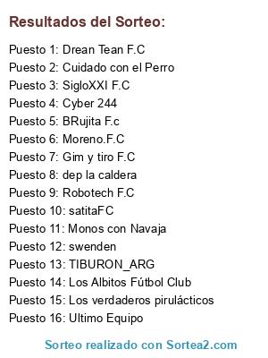 Lista de participantes: satitaFC, Robotech F.C, Moreno.F.C, SigloXXI F.C, Monos con Navaja, dep la caldera, Cuidado con el Perro, swenden, Ultimo Equipo, Drean Tean F.C, Gim y tiro F.C, Cyber 244, Los Albitos Fútbol Club, TIBURON_ARG, BRujita F.c, Los verdaderos pirulácticos.