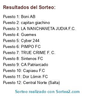 Lista de participantes: Capiasu F.C, LA IVANCHANETA JUDIA F.C., Boni AB, capitan giachino, TRUE CRIME F. C., CA Patriarcado, Cyber 244, Central Norte (Salta), Guemes, PIMPO FC, Sintenos FC, Dor Lómin FC.