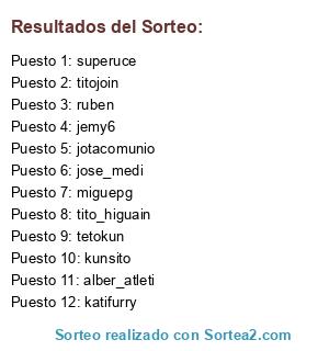 Lista de participantes: katifurry, jemy6, jotacomunio, superuce, miguepg, jose_medi, titojoin, kunsito, tito_higuain, alber_atleti, ruben, tetokun.