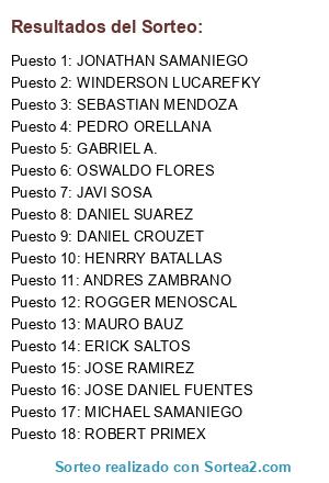 Lista de participantes: MAURO BAUZ, WINDERSON LUCAREFKY, JAVI SOSA, OSWALDO FLORES, JONATHAN SAMANIEGO, DANIEL CROUZET, GABRIEL A., JOSE RAMIREZ, ERICK SALTOS, JOSE DANIEL FUENTES, HENRRY BATALLAS, ROGGER MENOSCAL, DANIEL SUAREZ, MICHAEL SAMANIEGO, PEDRO ORELLANA, ROBERT PRIMEX, SEBASTIAN MENDOZA, ANDRES ZAMBRANO.