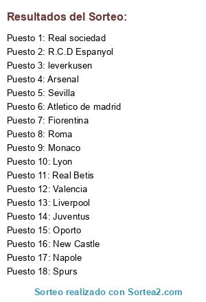 Lista de participantes: Arsenal, Spurs, Oporto, New Castle, Liverpool, Atletico de madrid, Valencia, Napole, Real sociedad, Juventus, Real Betis, Monaco, Roma, R.C.D Espanyol, Lyon, Sevilla, Fiorentina, leverkusen.