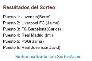 Lista de participantes: Liverpool FC (Jaime), Real Madrid (Inti), Juventus(Berto), PSG(Samu), Real Juvencia(David), FC Barcelona(Carlos).