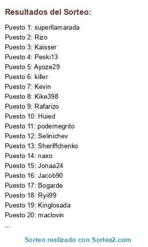Lista de participantes: Kevin, Kaisser, Sheriffchenko, Selinichev, Ryii99, killer, Kike398, alicate9, maclovin, Huied, Kinglosada, Bogarde, Peski13, podernegrito, Jacob90, naxo, Colmenero85, javivale, Ayoze29, superllamarada, Twisterswar, Rizo, Rafarizo, Jonaa24.