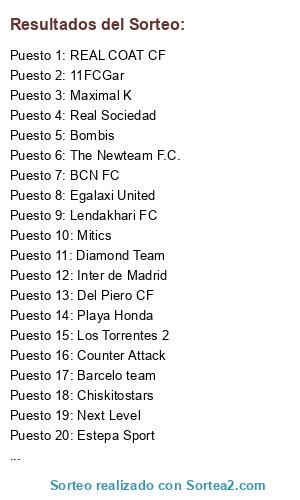 Lista de participantes: Egalaxi United, Sigras FC, Next Level, Diamond Team, Bombis, The Newteam F.C., Del Piero CF, Mitics, FC. ERIKA, Real Sociedad, Inter de Madrid, 11FCGar, Colts Patriots, Valencia CF, Chiskitostars, Maximal K, Estepa Sport, Counter Attack, Lendakhari FC, Los Torrentes 2, BCN FC, Montefrio C.F, Barcelo team, Playa Honda, REAL COAT CF.