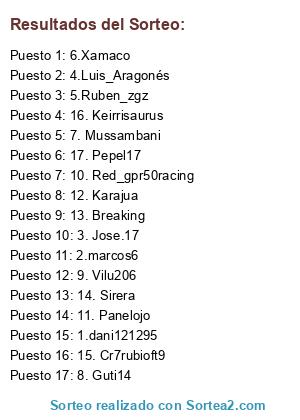 Lista de participantes: 1.dani121295, 2.marcos6, 3. Jose.17, 4.Luis_Aragonés, 5.Ruben_zgz, 6.Xamaco, 7. Mussambani, 8. Guti14, 9. Vilu206, 10. Red_gpr50racing, 11. Panelojo, 12. Karajua, 13. Breaking, 14. Sirera, 15. Cr7rubioft9, 16. Keirrisaurus, 17. Pepel17.