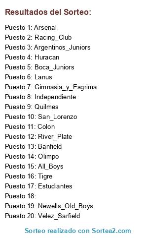 Lista de participantes: All_Boys, Huracan, Independiente, Lanus, Newells_Old_Boys, Olimpo, Quilmes, Racing_Club, River_Plate, San_Lorenzo, Tigre, Velez_Sarfield, Argentinos_Juniors, Arsenal, Banfield, Boca_Juniors, Colon, Estudiantes, Gimnasia_y_Esgrima, .
