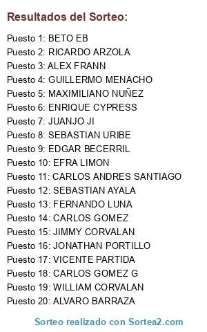 Lista de participantes: CARLOS GOMEZ, WILLIAM CORVALAN, JONATHAN PORTILLO, GUILLERMO MENACHO, SEBASTIAN AYALA, CARLOS ANDRES SANTIAGO, SEBASTIAN URIBE, JUANJO JI, BETO EB, ALEX FRANN, VICENTE PARTIDA, FERNANDO LUNA, EFRA LIMON, MAXIMILIANO NUÑEZ, ENRIQUE CYPRESS, EDGAR BECERRIL, ALVARO BARRAZA, JIMMY CORVALAN, CARLOS GOMEZ G, RICARDO ARZOLA.