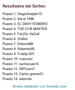 Lista de participantes: FaLlOo VaGxX, adomitis, EL DANY ROMERO, mariozzil, THE GYB MASTER, Carlos gomez51, Freddy 007, Edworld98, Robertito00, Kal el 1986, cachacuas14, Grilliris, ARTmani7, DiegoSneijder10.