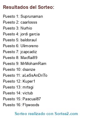 Lista de participantes: victub, Flywoods, dsanze, MrMohamRam, Ulimoreno, jordi garcia, jcapcadiz, Suprunaman, aLeSsAnDriTo, Kuper1, Pascual87, mrtsgi, baldoraul, caarlosss, Macflai89, Nurhio.