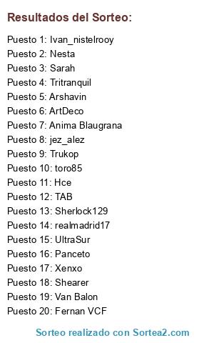 Lista de participantes: Arshavin, Shearer, ArtDeco, Sarah, Sherlock129, Nesta, Ivan_nistelrooy, jez_alez, Anima Blaugrana, Hce, Xenxo, TAB, Van Balon, Trukop, Fernan VCF, toro85, Tritranquil, UltraSur, realmadrid17, Panceto.