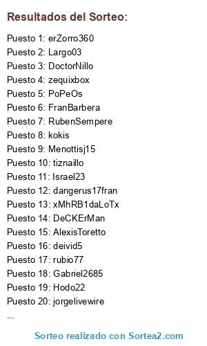 Lista de participantes: AlexisToretto, PoPeOs, RubenSempere, miguel1284, danilambert, deivid5, jorgelivewire, kokis, tiznaillo, erZorro360, rubio77, Israel23, Menottisj15, PETER10PELUSA, PRTIllegalKo, GeorgeJungla, PRTPatatuelas, V3rson, Largo03, Hodo22, DoctorNillo, FranBarbera, Gabriel2685, riverofifa, DeCKErMan, barce1ona1997, xMhRB1daLoTx, Arka11, dangerus17fran, zequixbox.