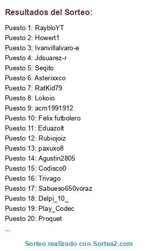 Lista de participantes: Eduazolt, RatKid79, Delpi_10_, Lokoio, o00rlm00o, Jdsuarez-r, Ivanvillalvaro-e, miha2k_jucator, paxuxo8, acm1991912, Rubiojoiz, Play_Codec, Codisco0, Chepe924, Proquet, Felix futbolero, Howert1, Sabueso650voraz, RaybloYT, Seqito, Agustin2805, Asterixxco, Trivago, Golin82.