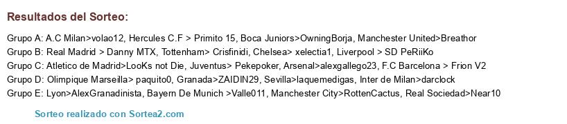 Lista de participantes: F.C Barcelona > Frion V2, Real Madrid > Danny MTX, Hercules C.F > Primito 15, Chelsea> xelectia1, Liverpool > SD PeRiiKo, Real Sociedad>Near10, Bayern De Munich >Valle011, Arsenal>alexgallego23, Granada>ZAIDIN29, Manchester United>Breathor, Inter de Milan>darclock, Atletico de Madrid>LooKs not Die, A.C Milan>volao12, Boca Juniors>OwningBorja, Manchester City>RottenCactus, Sevilla>laquemedigas, Lyon>AlexGranadinista, Juventus> Pekepoker, Tottenham> Crisfinidi, Olimpique Marseilla> paquito0.