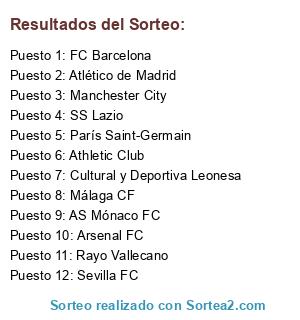 Lista de participantes: Arsenal FC, AS Mónaco FC, Athletic Club, Atlético de Madrid, Cultural y Deportiva Leonesa, FC Barcelona, Málaga CF, Manchester City, París Saint-Germain, Rayo Vallecano, Sevilla FC, SS Lazio.