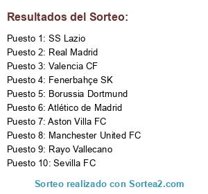 Lista de participantes: Rayo Vallecano, Sevilla FC, Atlético de Madrid, Real Madrid, Fenerbahçe SK, Manchester United FC, Valencia CF, Aston Villa FC, SS Lazio, Borussia Dortmund.
