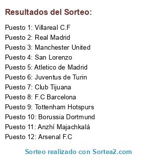 Lista de participantes: Arsenal F.C, Anzhí Majachkalá, Atletico de Madrid, F.C Barcelona, Borussia Dortmund, Juventus de Turin, Manchester United, Real Madrid, Club Tijuana, Tottenham Hotspurs, San Lorenzo, Villareal C.F.