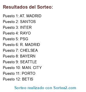 Lista de participantes: MAN. CITY, BAYERN, BETIS, PSG, AT. MADRID, R. MADRID, INTER, RAYO, PORTO, CHELSEA, SEATTLE, SANTOS.