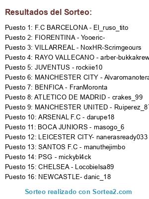 Lista de participantes: BOCA JUNIORS - masogo_6, ATLETICO DE MADRID - crakes_99, CHELSEA - Locobielsa89, LEICESTER CITY- nanerasready033, SANTOS F.C - manuthejimbo, PSG - mickybl4ck, RAYO VALLECANO - arber-bukkakrew, NEWCASTLE- danic_18, MANCHESTER UNITED - Ruiperez_87, ARSENAL F.C - darupe18, MANCHESTER CITY - Alvaromanoteras, FIORENTINA - Yooeric-, BENFICA - FranMoronta, VILLARREAL - NoxHR-Scrimgeours, JUVENTUS - rockiie10, F.C BARCELONA - El_ruso_tito.