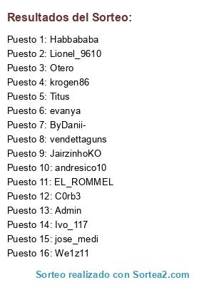 Lista de participantes: Admin, Otero, Titus, Habbababa, C0rb3, Lionel_9610, Ivo_117, We1z11, EL_ROMMEL, andresico10, JairzinhoKO, ByDanii-, vendettaguns, jose_medi, krogen86, evanya.