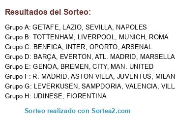 Lista de participantes: R. MADRID, ATL. MADRID, VALENCIA, SEVILLA, VILLAREAL, BARÇA, GETAFE, ASTON VILLA, MAN. UNITED, LIVERPOOL, TOTTENHAM, ARSENAL, CITY, EVERTON, LAZIO, FIORENTINA, JUVENTUS, UDINESE, ROMA, GENOA, INTER, NAPOLES, SAMPDORIA, MILAN, BREMEN, LEVERKUSEN, OPORTO, MARSELLA, BENFICA, MUNICH.