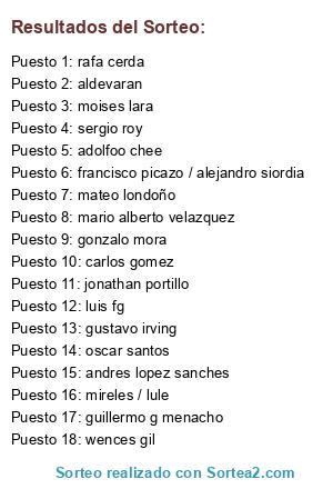 Lista de participantes: oscar santos, guillermo g menacho, luis fg, mateo londoño, moises lara, jonathan portillo, gonzalo mora, rafa cerda, carlos gomez, wences gil, aldevaran, sergio roy, mario alberto velazquez, mireles / lule, francisco picazo / alejandro siordia, andres lopez sanches, adolfoo chee, gustavo irving.