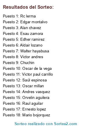 Lista de participantes: Chuchin, Rc lerma, Andres vasquez, Victor andres, Walter hayabusa, Edher ramirez, Victor paul carrillo, Esau zamora, Mario bojorquez, Aldair lozano, Edgar montalvo, Oscar millan, Saúl espinosa, Alan chavez, Ernesto lopez, Raul aguilar, Orvelin aguilera, Oscar de la vega.
