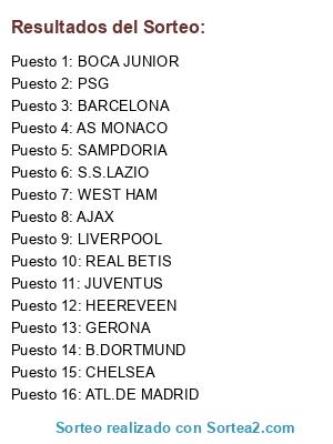 Lista de participantes: LIVERPOOL, B.DORTMUND, WEST HAM, REAL BETIS, AJAX, CHELSEA, S.S.LAZIO, BARCELONA, BOCA JUNIOR, ATL.DE MADRID, GERONA, SAMPDORIA, AS MONACO, HEEREVEEN, PSG, JUVENTUS.