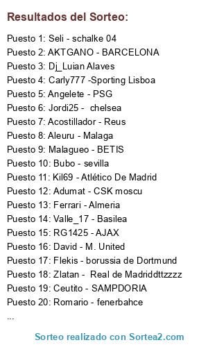 Lista de participantes: Flekis - borussia de Dortmund, AKTGANO - BARCELONA, Carly777 -Sporting Lisboa, Acostillador - Reus, Aleuru - Malaga, Zlatan - Real de Madriddttzzzz, Cortex - Liverpool, Valle_17 - Basilea, Romario - fenerbahce, Seli - schalke 04, Jordi25 - chelsea, RG1425 - AJAX, David - M. United, NisteR - Leizip, Bubo - sevilla, Kil69 - Atlético De Madrid, Dj_Luian Alaves, Soccatala- stoke city, Fista-español, Adumat - CSK moscu, Ceutito - SAMPDORIA, Malagueo - BETIS, Angelete - PSG, Ferrari - Almeria.