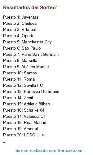 Lista de participantes: Juventus, FC Barcelona, Villareal, Arsenal, Manchester United, Inter Milán, Chelsea, Valencia CF, Real Madrid, Málaga, Lazio, Santos, Marsella, Schalke 04, CSKA Moscú, Liverpool, Zenit, Roma, Bayern Munich, AC Milan, Borussia Dortmund, LOSC Lille, Sevilla FC, Sao Paulo, Paris Saint Germain, Nápoles, Atlético Madrid, Tottenham, Manchester City, Athletic Bilbao, Oporto, Lyon.