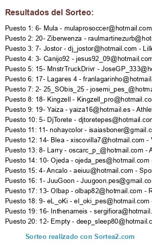 Lista de participantes: @Juugoon.pes, @josemi_pes_, @jesus92_09, @aeiuu, @djtoretepes, @mulaprosoccer, @dj_jostor, @oscarc_p_, @el_oki_pes, @ojeda_pes, @isaiasboner, @deep_sleep80, @olbap82, @xiscovilla7, @JoseGP_333, @sergifiora, @franlagarinho, @Kingzell_pro, @yaiza16, @raulmartinezurb.