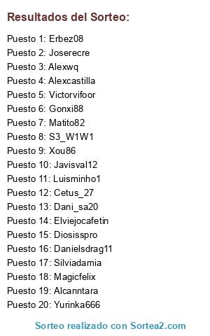 Lista de participantes: Cetus_27, Magicfelix, Elviejocafetin, Danielsdrag11, Alexwq, S3_W1W1, Luisminho1, Victorvifoor, Erbez08, Silviadamia, Javisval12, Yurinka666, Alcanntara, Dani_sa20, Xou86, Joserecre, Matito82, Diosisspro, Alexcastilla, Gonxi88.