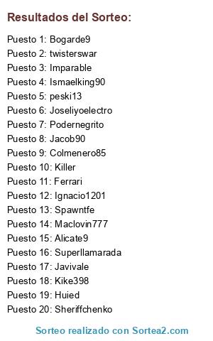 Lista de participantes: Sheriffchenko, Podernegrito, Joseliyoelectro, Killer, twisterswar, Colmenero85, Huied, Maclovin777, Superllamarada, Ismaelking90, Javivale, Kike398, Alicate9, Jacob90, Ferrari, Bogarde9, peski13, Imparable, Spawntfe, Ignacio1201.