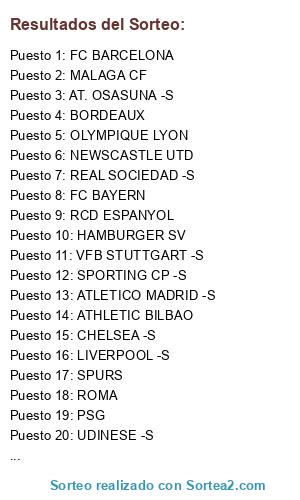 Lista de participantes: MILAN, AJAX -S, ARSENAL -S, ATLETICO MADRID -S, BORDEAUX, AT. OSASUNA -S, CHELSEA -S, FC BARCELONA, FC SCHALKE 04, GETAFE CF, LIVERPOOL -S, MANCHESTER CITY, RAYO VALLECANO, REAL MADRID -S, REAL SOCIEDAD -S, SPORTING CP -S, VFB STUTTGART -S, VFL WOLFSBURG, VILLARREAL CF, ATHLETIC BILBAO, BOR. DORTMUND -S, EVERTON -S, FC BAYERN, FIORENTINA, HAMBURGER SV, INTER, LAZIO -S, MALAGA CF, OLYMPIAKOS, PANATHINAIKOS, RCD ESPANYOL, ROMA, SPURS, UD LAS PALMAS, UDINESE -S, WERDER BREMEN, BAYER 04, BOCA JUNIOR -S, NAPOLI, NEWSCASTLE UTD, OLYMPIQUE LYON, PSG, RC DEPORTIVO -S, R. SPORTING, R. ZARAGOZA, SAMPDORIA, SEVILLA.