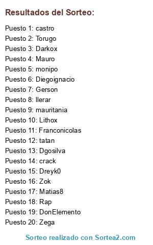 Lista de participantes: Matias8, Diegoignacio, Dreyk0, DonElemento, Rap, Mauro, Franconicolas, Darkox, Gerson, Dgosilva, Lithox, Zok, castro, crack, tatan, monipo, llerar, mauritania, Zega, Torugo.