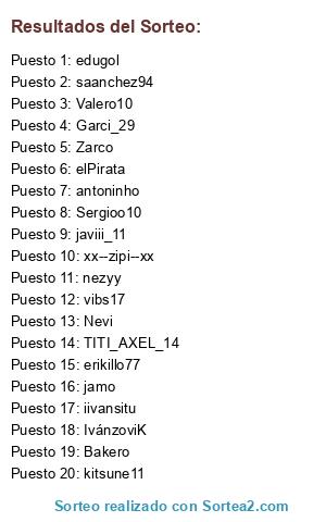Lista de participantes: javiii_11, elPirata, IvánzoviK, jamo, Bakero, Sergioo10, iivansitu, saanchez94, xx--zipi--xx, kitsune11, TITI_AXEL_14, Garci_29, Nevi, nezyy, edugol, antoninho, Valero10, vibs17, erikillo77, Zarco.