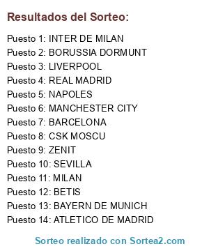 Lista de participantes: BAYERN DE MUNICH, BORUSSIA DORMUNT, SEVILLA, REAL MADRID, MILAN, CSK MOSCU, BARCELONA, ATLETICO DE MADRID, MANCHESTER CITY, LIVERPOOL, NAPOLES, INTER DE MILAN, BETIS, ZENIT.