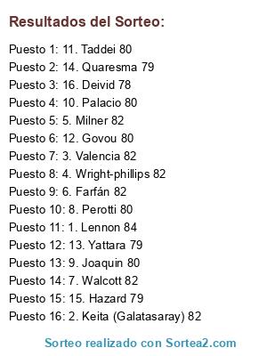 Lista de participantes: 1. Lennon 84, 2. Keita (Galatasaray) 82, 3. Valencia 82, 4. Wright-phillips 82, 5. Milner 82, 6. Farfán 82, 7. Walcott 82, 8. Perotti 80, 9. Joaquin 80, 10. Palacio 80, 11. Taddei 80, 12. Govou 80, 13. Yattara 79, 14. Quaresma 79, 15. Hazard 79, 16. Deivid 78.