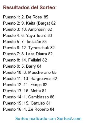 Lista de participantes: 1. Cambiasso 86, 2. De Rossi 85, 3. Mascherano 85, 4. Zé Roberto 84, 5. Barry 84, 6. Yaya Touré 83, 7. Toulalán 83, 8. Lass Diarra 82, 9. Keita (Barça) 82, 10. Ambrosini 82, 11. Frings 82, 12. Tymoschuk 82, 13. Hargreaves 82, 14. Fellaini 82, 15. Gattuso 81, 16. Motta 81.