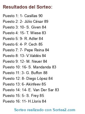 Lista de participantes: 1- Casillas 90, 2- Júlio César 89, 3- G. Buffon 88, 4- P. Cech 85, 5- S. Frey 85, 6- Akinfeev 85, 7- Pepe Reina 84, 8- Diego López 84, 9- R. Adler 84, 10- S. Given 84, 11- H.Lloris 84, 12- M. Neuer 84, 13- V.Valdés 84, 14- E. Van Der Sar 83, 15- T. Wiese 83, 16- S. Mandanda 83.