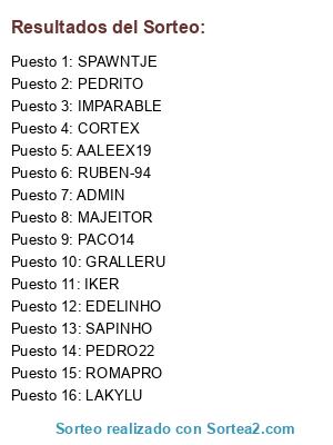 Lista de participantes: PACO14, PEDRO22, ROMAPRO, GRALLERU, CORTEX, EDELINHO, AALEEX19, MAJEITOR, IMPARABLE, ADMIN, PEDRITO, RUBEN-94, SAPINHO, SPAWNTJE, LAKYLU, IKER.