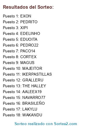 Lista de participantes: PACO14, LAKYLU, AALEEX19, EXON, THE HALLEY, IKERPASTILLAS, WAKANDU, EDUOITA, XIPI, PEDRITO, EDELINHO, BRASILEÑO, CORTEX, MAJEITOR, GRALLERU, MAGUS, PEDRO22, NAVARRO77.