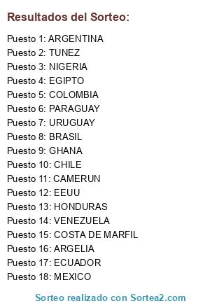 Lista de participantes: CHILE, ECUADOR, EEUU, MEXICO, COSTA DE MARFIL, EGIPTO, ARGELIA, BRASIL, COLOMBIA, URUGUAY, ARGENTINA, GHANA, NIGERIA, TUNEZ, CAMERUN, HONDURAS, PARAGUAY, VENEZUELA.