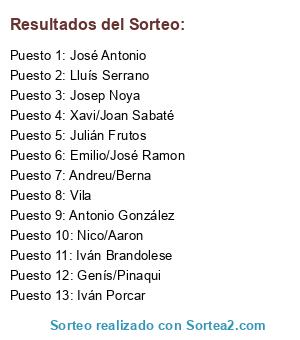 Lista de participantes: Nico/Aaron, Lluís Serrano, Iván Porcar, Vila, Antonio González, Andreu/Berna, Julián Frutos, Xavi/Joan Sabaté, Emilio/José Ramon, José Antonio, Genís/Pinaqui, Josep Noya, Iván Brandolese.