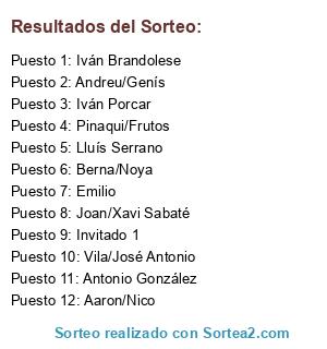 Lista de participantes: Berna/Noya, Joan/Xavi Sabaté, Iván Porcar, Invitado 1, Andreu/Genís, Pinaqui/Frutos, Antonio González, Vila/José Antonio, Iván Brandolese, Emilio, Aaron/Nico, Lluís Serrano.