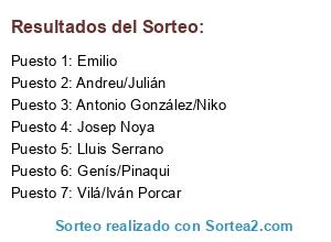 Lista de participantes: Vilá/Iván Porcar, Antonio González/Niko, Lluis Serrano, Genís/Pinaqui, Emilio, Andreu/Julián, Josep Noya.