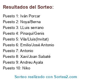 Lista de participantes: Vila/Lluis(Invitat), Niko, Emilio/José Antonio, Iván Porcar, Noya/Berna, Pinaqui/Genis, Antonio, LLuis serrano, Andreu Ayala, Xavi/Joan Sabaté.