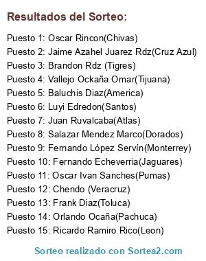Lista de participantes: Juan Ruvalcaba(Atlas), Fernando López Servín(Monterrey), Jaime Azahel Juarez Rdz(Cruz Azul), Baluchis Diaz(America), Brandon Rdz (Tigres), Oscar Ivan Sanches(Pumas), Oscar Rincon(Chivas), Orlando Ocaña(Pachuca), Ricardo Ramiro Rico(Leon), Luyi Edredon(Santos), Frank Diaz(Toluca), Vallejo Ockaña Omar(Tijuana), Salazar Mendez Marco(Dorados), Fernando Echeverria(Jaguares), Chendo (Veracruz).