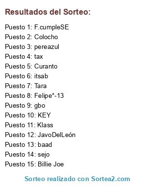 Lista de participantes: tax, Colocho, Billie Joe, JavoDelLeón, KEY, Klass, Felipe*-13, F.cumpleSE, itsab, sejo, Curanto, baad, gbo, Tara, pereazul.